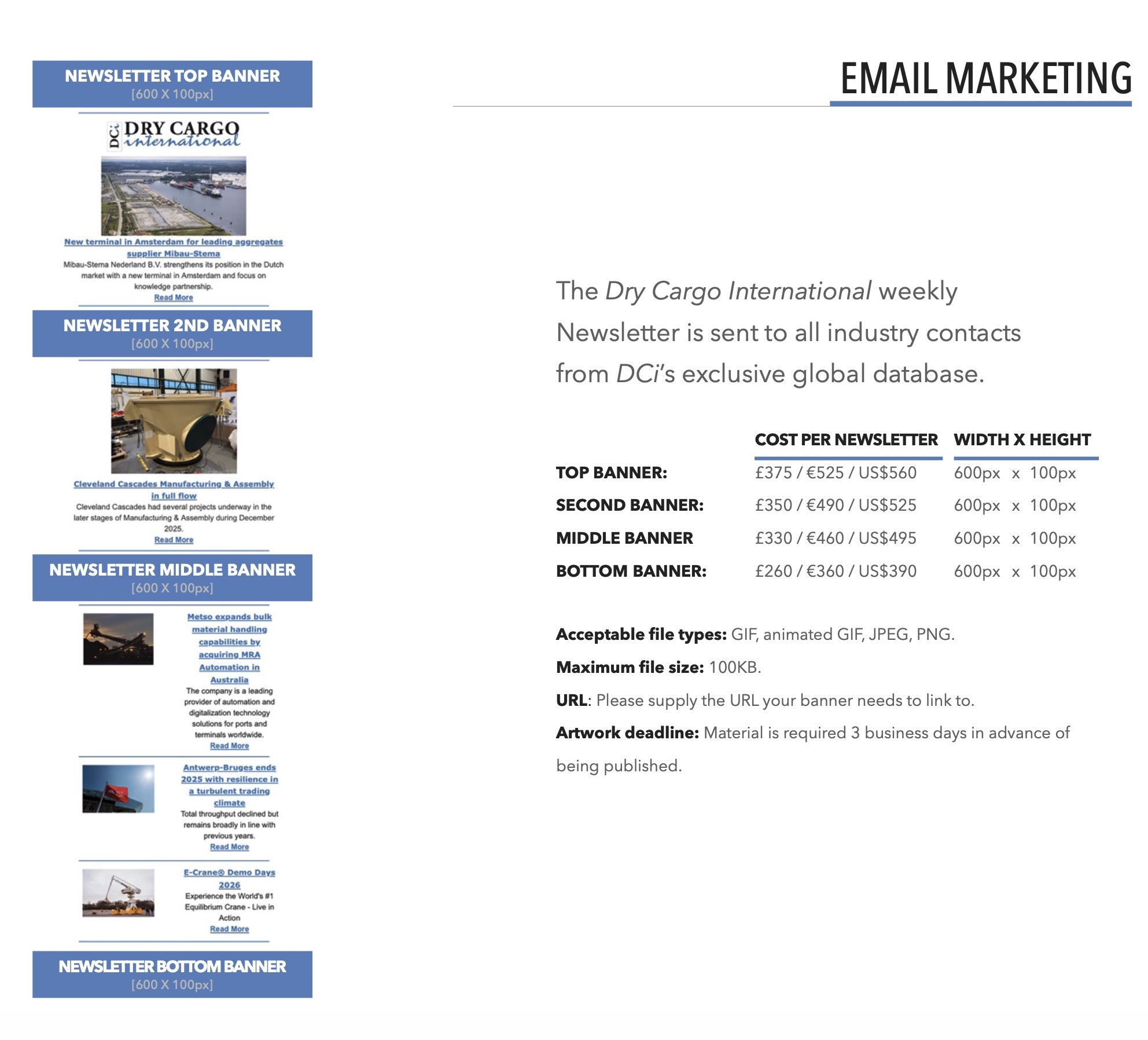 Advertising with a banner on a daily basis by linking clients directly to any page within your own site enables you to reach potential customers within the international dry bulk industry. It benefits your organisation through blanket exposure, thereby enhancing your worldwide image.