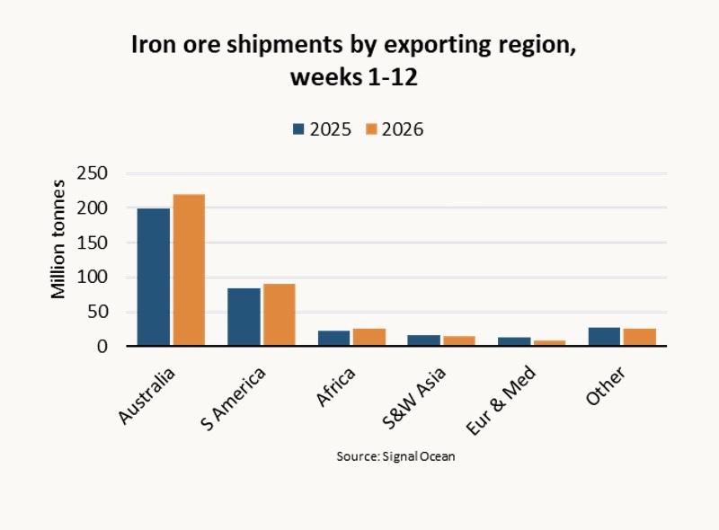 “The Iran war is having a negative but limited direct impact on the iron ore trade. Shipments via the Strait of Hormuz only account for 2% of tonne mile demand, while Oman accounts for an additional 2%. However, the war has reduced the availability of diesel, which could impact mining operations in countries such as Australia and South Africa as they rely on diesel imports. Furthermore, the economic impacts from higher energy prices could further challenge domestic steel demand in China,” says Gouveia.