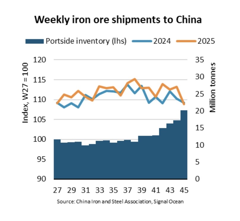 “Iron ore shipments to China have risen 7% y/y since the end of June, following a stable period during the first half of the year. However, Chinese steel production has remained weak, leading to a build-up of portside inventories which reached an eight-month high in week 45,” says Filipe Gouveia, Shipping Analysis Manager at BIMCO.