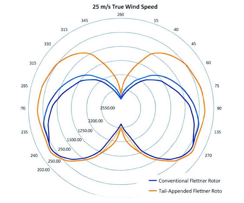Polar diagram at a 25m/s True Wind Speed comparing a conventional Flettner rotor with the tail-appended Flettner rotor.