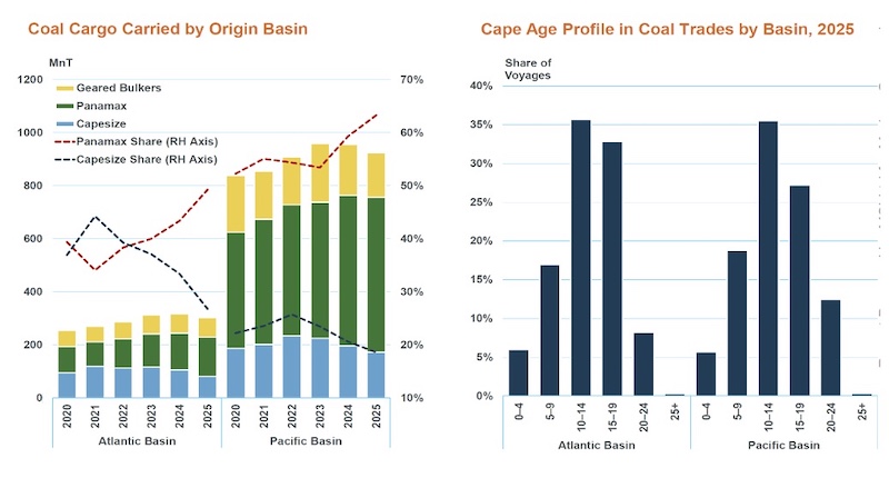 In 2025, Capesizes’ share of global coal trade fell from 23.3% to 20.3% by cargo weight, while Panamax increased its share from 55.3% to nearly 60%. The shift reflects a broader structural pattern, with Panamax gaining share in the Atlantic since 2021 and in the Pacific since 2023.